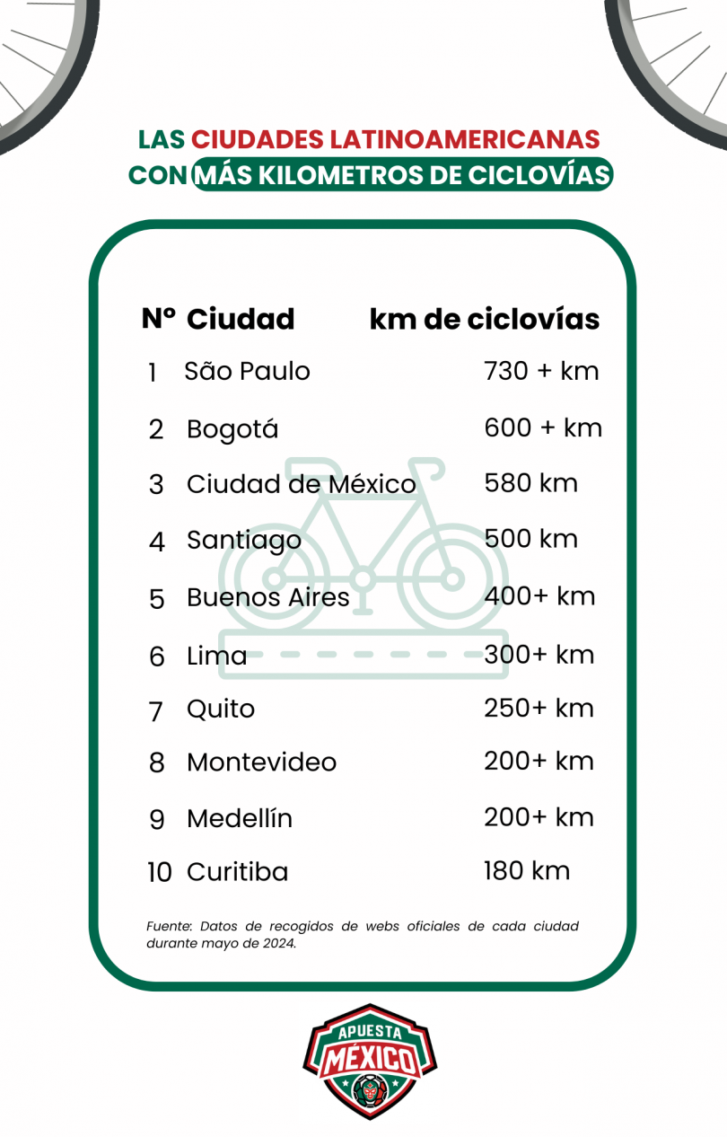 En un mundo cada vez más consciente de la necesidad de un transporte sostenible y amigable con el medio ambiente, la bicicleta se ha convertido en una opción cada vez más popular en las ciudades de América Latina. Por este motivo, ApuestaMéxico, la web más confiable de noticias sobre juegos de azar en línea, los mejores bonos e información legal sobre apuestas deportivas en México, ha llevado un análisis para conocer cuáles son las ciudades latinoamericanas con mayor número de kilómetros de ciclovías.