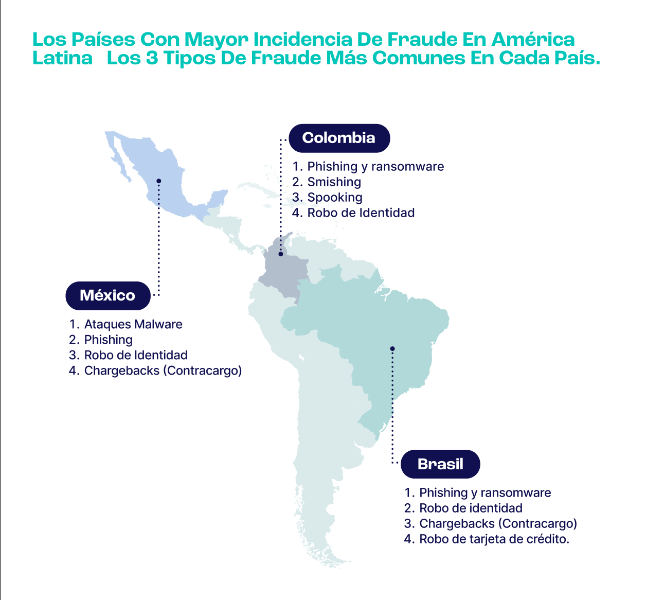 Concretamente, en América Latina, los países que más han sufrido el aumento del fraude en línea son Colombia, México y Brasil. Las crisis económicas anteriores en la región también han exacerbado este problema, teniendo como fraudes más comunes el fraude con tarjetas de crédito, el robo de identidad, el phishing y los ataques de ingeniería social.