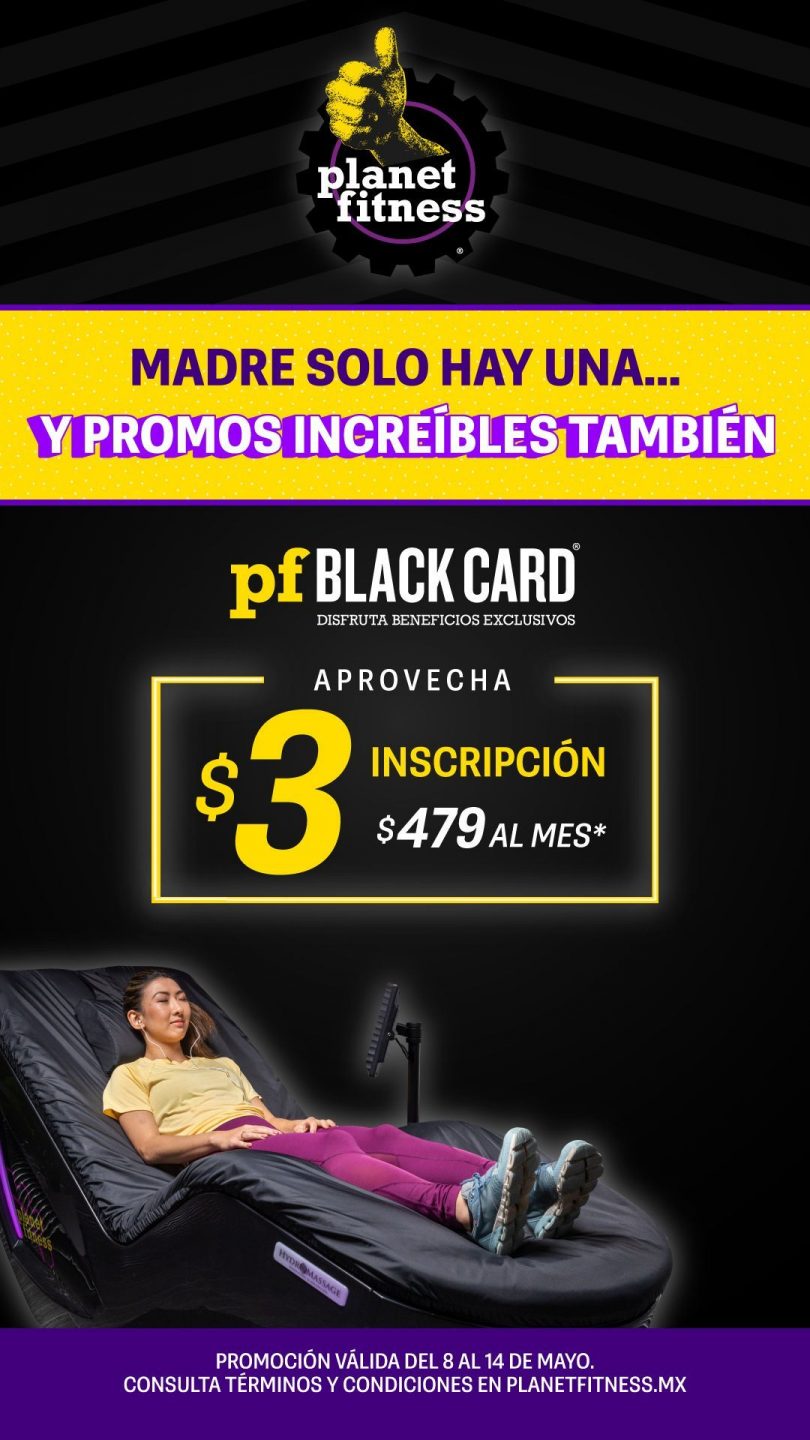 «Celebra a mamá con el regalo perfecto! Del 8 al 14 de mayo, aprovecha la promoción especial en la membresía PF Black Card® con inscripción de $3 y mensualidades de $479».