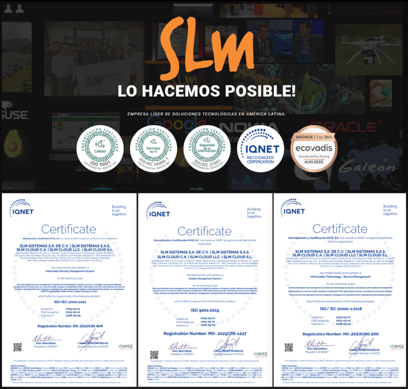 Emitidas por NYCE (Normalización y Certificación NYCE S.C.) y reconocidas a nivel global por IQNET, estas certificaciones colocan a SLM como una de las pocas empresas del sector tecnológico con una validación internacional tan robusta y diversificada, que abarca múltiples territorios operativos y todos sus centros de servicio críticos.
