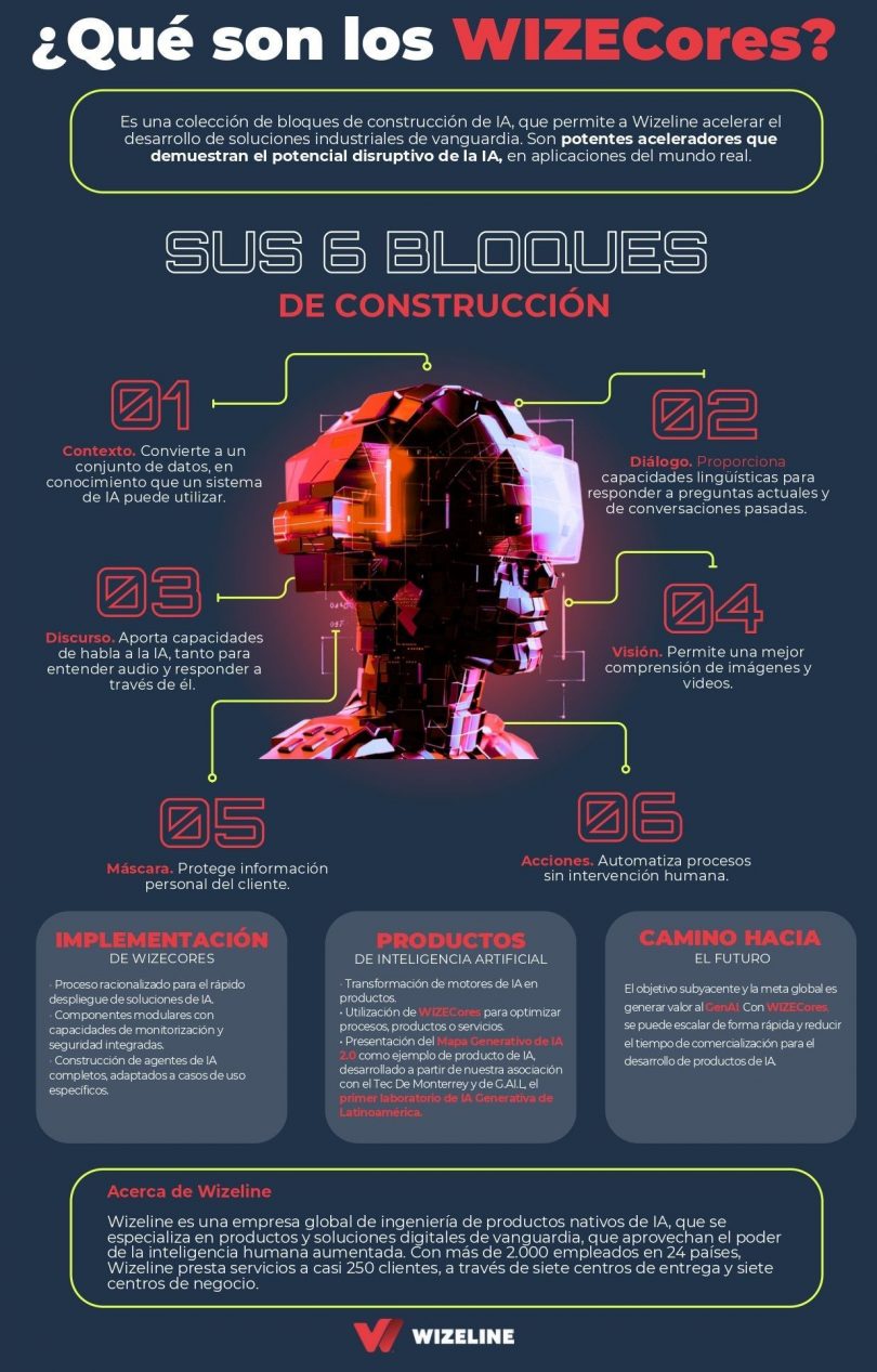 - WIZECores: Es una colección de componentes básicos de IA que permite a Wizeline acelerar el desarrollo de soluciones industriales de vanguardia. Mucho más que simples prototipos, WIZECores son potentes aceleradores que demuestran el potencial disruptivo de la IA en aplicaciones del mundo real.